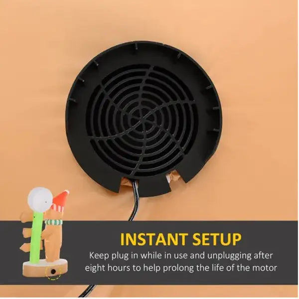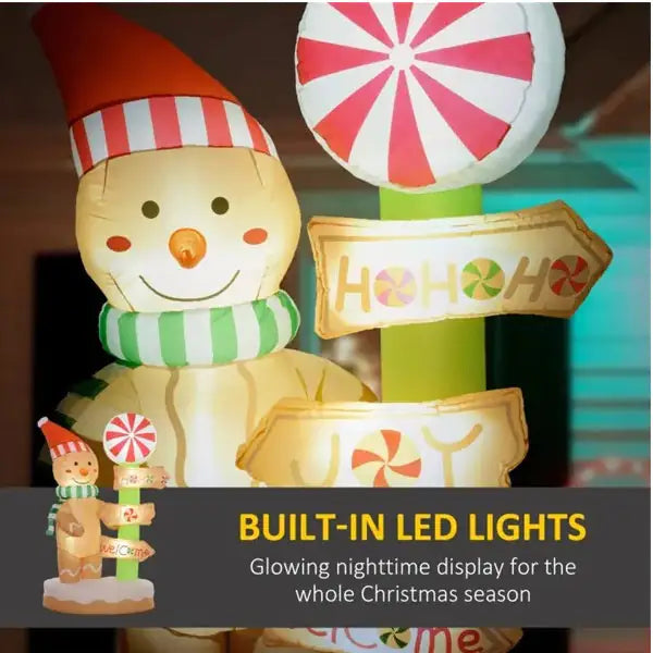 Specification Available Ship to: United States Details Features: - Gingerbread man and a signpost Christmas inflatables design - LED lights to create a jolly, magical, and eye-catching effect - Deflates for easy storage (when you're not dazzling your neighbors) - Includes five ground stakes, three drawstrings and a sandbag to help keep it anchored on windy nights - Rated IP44 polyester cloth is suited for indoor and outdoor use Specification: - Primary Color: Brown - Type: Inflatable Christmas gingerbread man and signpost - Material: Polyester Cloth - Overall Dimensions: 45.3" W x 27.6" D x 71.7" H - Power Cable Length: 9.8 ft. - LED Light Power: 0.25 W - Fan: DC 12 V / 1 A - Input Voltage: AC 120 V, 50/60 Hz - Transformer Output Voltage: DC 12 V / 1.25 A - Certifications: IP44, CEC, UL/ETL/CSA - Item Label: 844-972V80BN NOTE: - Ensure the air blower is always connected to the power source to keep the product inflated, but not above eight hours a time for long motor service life - Do not use the inflatable outside in heavy rain, snow, or wind Package Includes: - 1 x Inflatable Gingerbread Man - 5 x Ground Stake - 3 x Drawstring - 1 x Air Blower - 1 x Sandbag - 1 x Manual